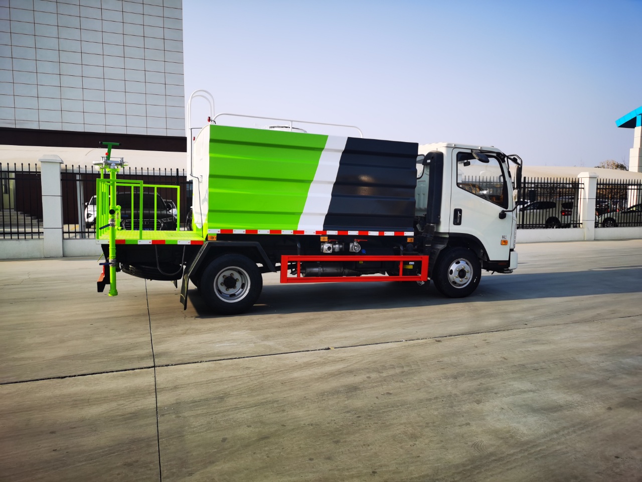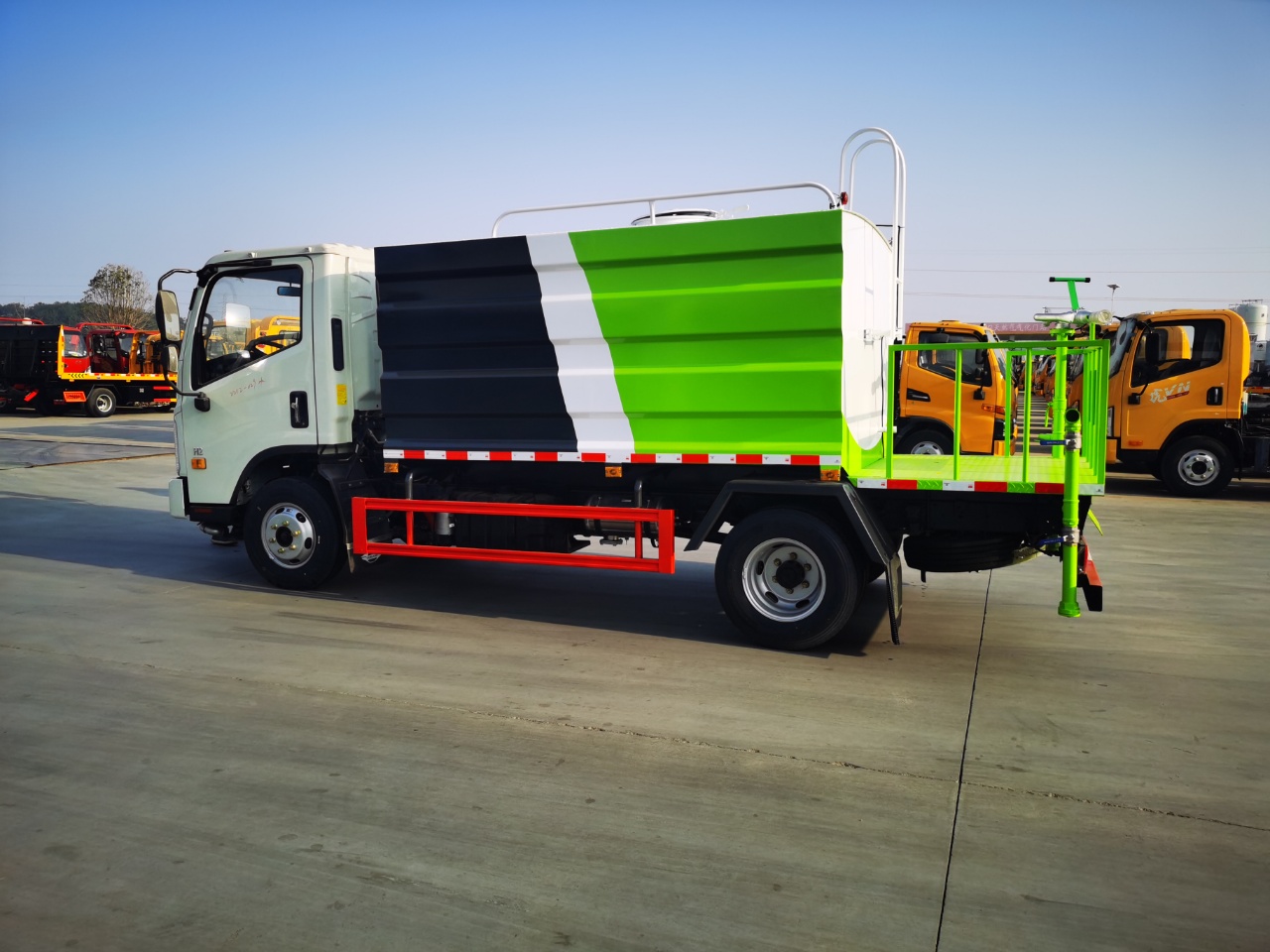 方形罐體,多款樣式可選,罐體容積7.4立方,采用億豐優(yōu)質(zhì)40/50灑水泵,全車不銹鋼大通徑球閥,灑水車功能,前沖,后灑,側(cè)噴,帶工作平臺(tái)。高炮360度旋轉(zhuǎn),可調(diào)節(jié)成大雨,小雨,霧狀,柱狀,帶隨車工具,帶兩根等長(zhǎng)的2.5米抽水管,帶電邊燈,其他標(biāo)配。尾部超大平臺(tái)。帶霧炮和不帶霧炮均可包上藍(lán)牌!